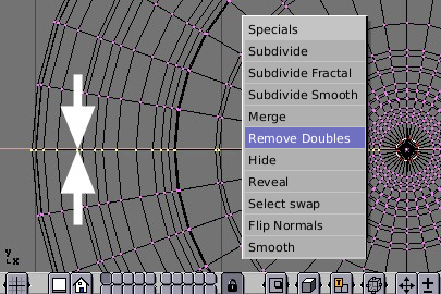 To weld two vertices together, select both of the by holding SHIFT and RIGHT_CLICKING on them. Press SKEY to start scaling and hold down CONTROL while scaling to scale the points down to 0 units in the X,Y and Z axis. LEFT_CLICK to complete the scaling operation and click the "Remove Doubles" button in the EditButtons window. |