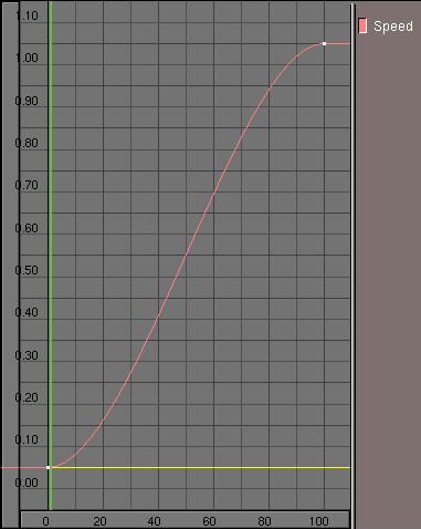 We will choose "Absolute Vertex Key" a yellow horizontal line is drawn in the IpoWindow. This is the first key and thus the reference Key. An IpoCurve is also created for "Speed" (Figure 3 in the Section called The IPO Curves in the chapter called Animation of Undeformed Objects).