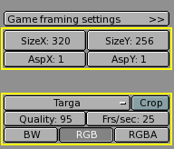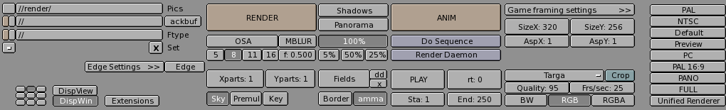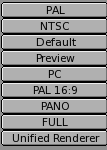 By default the dimensions are 320x256 and can be changed as for any NumButton. The two buttons below define the aspect ratio of the pixels. This is the ratio between the X and Y dimensions of the pixel of the image. By default it is 1:1 since computer screen pixels are square, but can be varied if television shorts are being made since TV pixels are not square. To make life easier the rightmost block of buttons (Figure 3) provides some common presets: