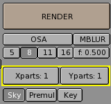By setting values different from 1 in the Xpart and Ypart in the left column of the central buttons (Figure 4) you force Blender to divide your image into a grid of Xpart x Ypart sub-images which are then rendered one after the other and finally assembled together.