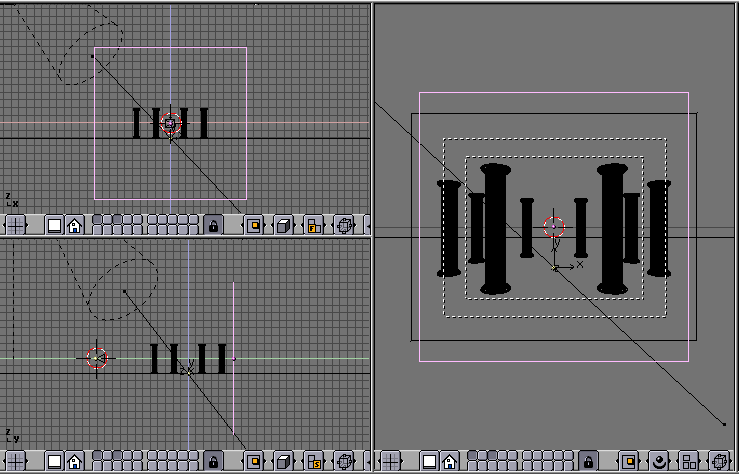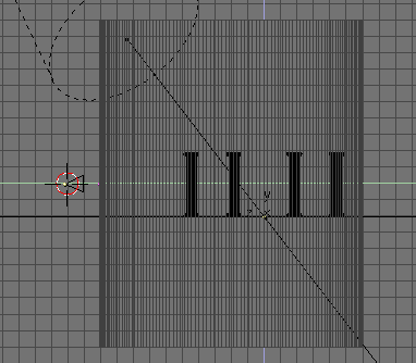 With the camera in the default position, turn to front view, and add a plane in front of the camera, with its center aligned with the camera wiewing direction. In side view move the plane where you want your volumetric effect to terminate. In our case somewhere beyond the furthest column. Scale the plane so that it encompasses all camera's viewing angle (Figure 4). It is important to have a camera in the default position, that is pointing along the y axis since we need the planes to be orthogonal to the direction of sight. We will anyway be able to move it later on.