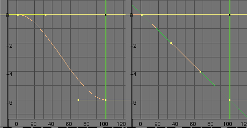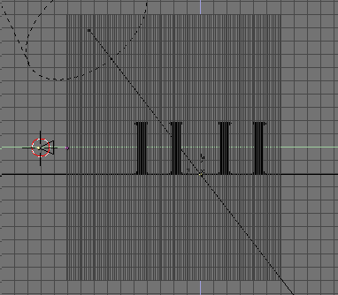 The 3D window, in side view, will show something like Figure 5. This is not good because planes are denser at the begin and at the end of the sweeep. With the plane still selected change to an IPO window (SHIFT F6). There will be three Loc IPOs, only one of which non-constant. Select it, swithc to EditMode (TAB) and select both control points. Now turn them from smooth to sharp with (VKEY) Figure 6.