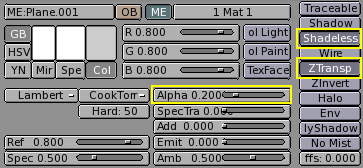 Now we must add the Mist material itself. The material should be Shadeless and cast no shadows to avoid undesired effects. It should have an small Alpha value (Figure 8) A material like this would basically act like Blender's built in mist, hence we would have no advantage in the resulting image. The drawback is that computing 100 transparent layer is very CPU intensive, expecially if one desires the better results of the Unified Renderer.