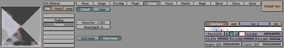 The second texture is the one giving the true edge on the built in mist. Add a Cloud texture, make its Noise Size=2, Noise Depth=6 and Hard Noise on (Figure 11). Add colorband to this too, going from pure white with Alpha=1 at Positoion 0 to a pale bluish gray with Alpha = 0.8 at a position of about 0.15, to a pinkish hue with Alpha 0.5 around position 0.2, ending to a pure white, Alpha=0 color at position 0.3. Of course you might want to go to greenish-yellow for swamp mists etc.