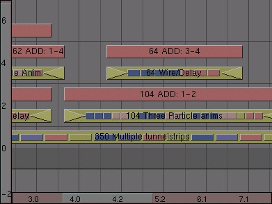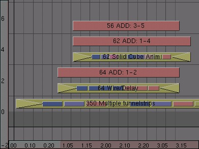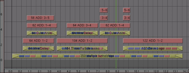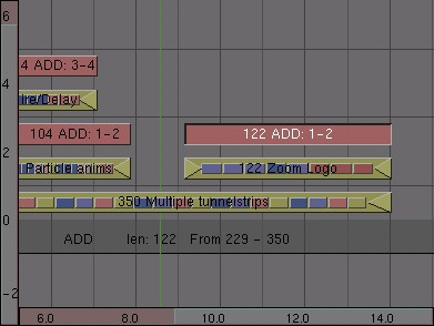 Now we already have 7 strips and we have only just begun with our animation! You can imagine that the screen can quickly become very crowded indeed. To make your project more manageable, select all strips (AKEY and BKEY work here, too!), press MKEY and press ENTER or click on the Make Meta pop up. The strips will now be combined into a meta-strip, and can be copied or moved as a whole.