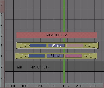 Now select both strips (hold down SHIFT), press SHIFT+A and add a SUB (subtract) effect. (Figure 18).