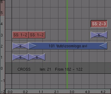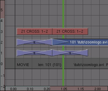 Take a closer look at the Sequence Editor screen now. Horizontally you see the time value. Vertically, you see the video 'channels'. Each channel can contain an image, a movie or an effect. By layering different channels on top of each other and applying effects, you can mix different sources together. If you select a video strip, its type, length and filename will be printed at the bottom of the window.