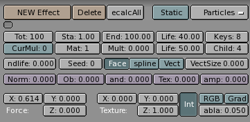 Our last effect will use an animated mask. By combining this with the logo of the previous step, I will achieve a streaking effect that introduces the logo to our animation. This mask is made by using a particle system. To set one up switch to side view, add a plane to your scene and while it is still selected switch to the Animation Buttons window (F7). Select 'New effect' and then change the default effect (build) to 'Particles'. Change the system's settings as indicated in Figure 33.