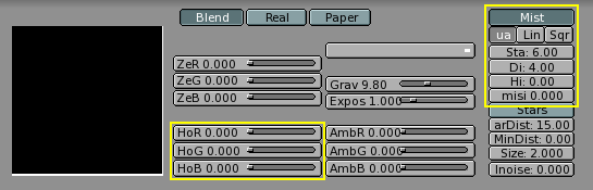By default, the sky will now be rendered as a gradient between blue and black. Change the horizon colors (HoR, HoG, HoB) to pure black (Figure 35).