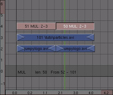 By now you know the drill: reload your compilation project file, switch to the Sequence Editor window and add both 'particles.avi' and 'logo.avi' to your project. Combine them together with a MUL effect. Since the logo animation is 50 frames and the particles animation is 100 frames, you'll need to duplicate the logo animation once and apply a second MUL effect to it (Figure 38 and Figure 38).
