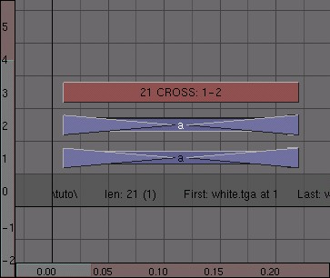 To see what's happening split the sequence editor window and select the image button in the header (Figure 10). This will activate the automatic preview (Figure 11). If you select a frame in the sequence editor window with the strips, the preview will be automatically updated (with all the effects applied!).