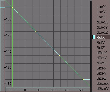 Second, to get a linear motion you need to remove the ease-in and ease-out of the rotation. These can be seen in the IPO window of the tube after inserting the rotation keyframes. The IPO smoothly starts and end, much like a cosine function. We want it to be straight. To do so select the rotation curve, enter editmode (TAB) and select all vertices (AKEY) and press VKEY ('Vector') to change the curve into a linear one (Figure 27).