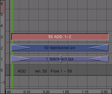 Reload your video compilation Blender file. The tunnel that we made in the last step will be used as a backdrop for the entire animation. To make it more interesting I will modify an ADD effect to change the tunnel into a pulsating backdrop. Prepare a completely black picture and call it 'black.tga' (try pressing F12 in an empty Blender file. Save with F3, but make sure that you have selected the TGA file format in the Render Buttons window). Add both black.tga and the tunnel animation and combine them with an ADD effect (Figure 30).