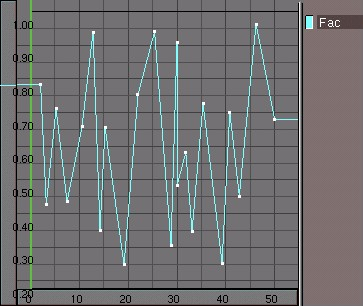 Now with the ADD effect selected, open an IPO window and select the Sequence Editor button in its header. From frame 1-50, draw an irregular line by holding down CTRL and left-clicking. Make sure that the values are between 0 and 1 (Figure 31).