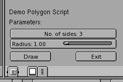 If you create a polygon.py file containing the above described code and load it into a Blender text window as you learned in the previous section and press ALT P in that window to run it you will see the script disappearing and the window turn grey. In the lower left corner the GUI will be drawn (Figure 2 )