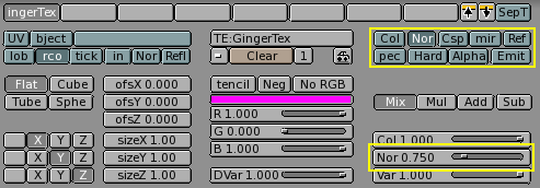 Go back to the Material Buttons (F5) and set the Texture buttons as in Figure 37. The only settings to change should actually be the un-seting of the Col Toggle Button and the setting of the Nor Toggle Button and rising the Nor slider to 0.75. This will make our Stucci texture to act as a "bumpmap" and making Gus look more biscuitlike.