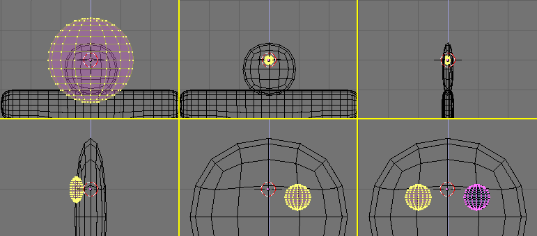 Place the cursor at the center of Gus head, remember you are in 3D so you must check at least two views to be sure! Add a sphere (SPACE>>ADD>>Mesh>>UVsphere). You will be asked for the number of Segments: (meridians) and Rings:(parallels) into wich divide the sphere. The default of 32 is too much for our aims here, use a value of 16 for both. The Sphere is in the first image top left of the sequence in Figure 41.