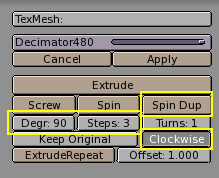 Now, in the Edit Buttons (F9) locate at the center the group of buttons in Figure 43. Set Degr: to 90, Steps: to 3 and verify that the Clockwise: TogButton is on. Then press SpinDup. This will create 3 duplicates of the selected vertices on an arc of 90° centered at the cursor. The result is Gus mouth, like in the last image of sequence Figure 42.