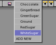The Buttons window will be populated by buttons and a string holding the Material name, "Material" by default will appear next to the white square button. Change this to something meaningfull, like GingerBread.