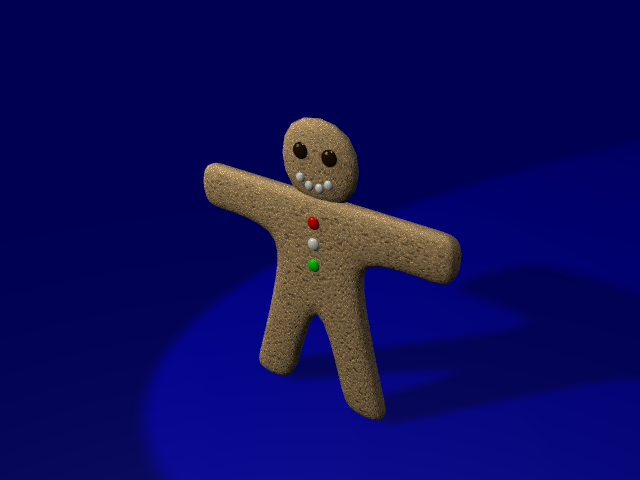 Give to the eyes a Choccolate-like material as the one at the top in Figure 45, give to the mouth a White Sugar like material like the one just below in Figure 45, give the buttons a Red, White and Green sugar like material. from top to bottom, these are in Figure 45 too.