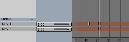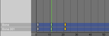 The ActionWindow gives an overview of the current Armature Keys and Relative Vertex Keys of the Object. It presents the time, in frames, on an horizontal axis and, vertically, as many stripes are there are bones in the armature or Relative Vertex Keys.