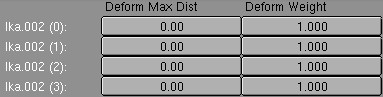 A Skeleton deformation can consist of multiple Ika Objects. These numbers determine the extent to which each Ika contributes to deformation.(Deform Weight) and how far this influence reaches (Deform Max Dist). A "Deform Max Dist" of zero works with an global fall-off, like in older Blender versions.