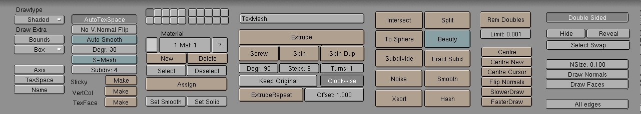 Automatic smooth rendering (not faceted) for meshes. Especially interesting for imported Meshes done in other 3D applications. The Button "Set smooth" also has to be activated to make "Auto Smooth" work. The smoothing isnīt displayed in the 3D Window.