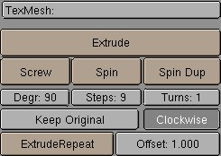 The most important of the Mesh tools: Extrude Selected. "Extrude" in EditMode converts all selected edges to faces. If possible, the selected faces are also duplicated. Grab mode starts immediately after this command is executed. If there are multiple 3DWindows, the mouse cursor changes to a question mark. Click at the 3DWindow in which "Extrude" must be executed. HotKey: EKEY.