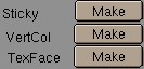 Blender allows you to assign a texture coordinate to Meshes that is derived from the way the Camera view sees the Mesh. The screen coordinates (only X,Y) are calculated from each vertex and these coordinates are stored in the Mesh. As if the texture is permanently projected and fixed on the Mesh as viewed from the Camera; it becomes "sticky". Use "Sticky" to match a 3D object exactly with the Image Texture of a 3D picture. This option also allows you to create special morphing effects. If the image is already "sticky", the button allows you to remove this effect.