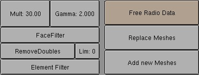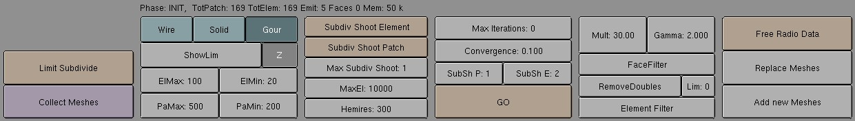 All selected and visible Meshes in the current Scene are converted to Patches. As a result some Buttons in the interface change color. Blender now has entered the Radiosity mode, and other editing functions are blocked until the button "Free Data" has been pressed. The "Phase" text prints the number of input patches. Important: check the number of "emit:" patches, if this is zero nothing interesting can happen!