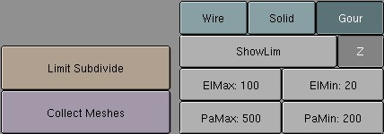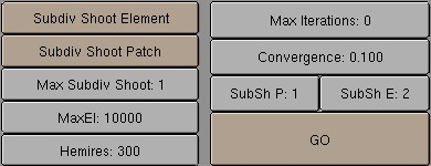 By shooting energy to the environment, errors can be detected that indicate a need for further subdivision of Patches. The subdivision is performed only once each time you call this function. The results are smaller Patches and a longer solving time, but a higher realism of the solution. This option can also be automatically performed when the "GO" action has started. Subdiv Shoot Element (But) By shooting energy to the environment, and detecting high energy changes (frequencies) inside a Patch, the Elements of this Patch are selected to be subdivided one exta level. The subdivision is performed only once each time you call this function. The results are smaller Elements and a longer solving time and probably more aliasing, but a higher level of detail. This option can also be automatically performed when the "GO" action has started.