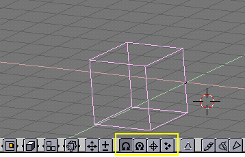 If the first button is pushed, the axis passes through the center of the selection's bounding box. (If only one object is selected, the point used is the center point of the object, which must not necessarily be in the geometric center: in Figure 1 it is on the middle of the rightmost edge, marked by a purple dot. For more on this point, see the Section called EditMode in the chapter called Mesh Modelling.)
