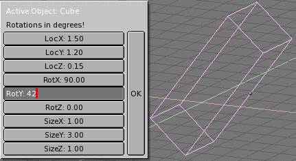 At some point, you may want to display the effect of your object editing in numbers. Or, if you know the location, rotation and scaling values for an object, you may want to enter them directly instead of having to create them with the mouse. To do this, select the object you want to edit and press NKEY. The number dialog (Figure 2) is displayed; SHIFT-LMB-click a number to enter a value, press OK to confirm the changes or move the mouse outside the window to cancel.