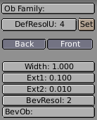 Then add the text in front view, set "Ext1" to 0.1 - making the text 3D, and set "Ext2" to 0.01, adding a nice bevel to the edge. Make the "BevResol" 1 or 2 to have a smooth bevel and lower the resolution so that the vertex count will not not be too high when you subdivide the object later on (Figure 51). Convert the object to curves, then to a mesh, (ALT+C twice) because the warp tool does not work on text or on curves. Subdivide the mesh twice, so that the geometry will change shape cleanly, without artifacts.