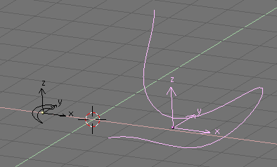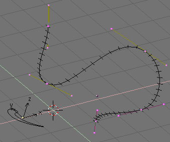 If the Path is 3D the "plane of the path" is defined locally rather than globally and is visually rendered, in EditMode, by several short segments perpendicular to the Path (Figure 31);
