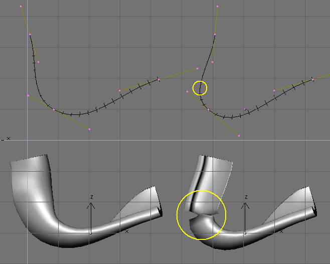 Figure 32 clearly shows the problem. On the left there is a Path whose steepness is such that the normal to the local Path Plane is always upward. On the right a Path where, at the point circled in yellow, such a normal begins to point down. The result of the extrusion presents an abrupt turn there.