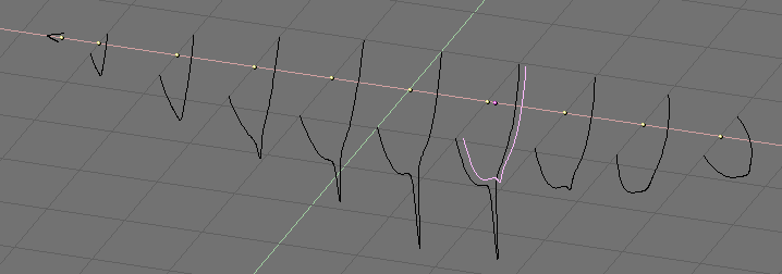 Now duplicate (SHIFT-D) as many times as needed, to the left and to the right, the curve (Figure 35). Adjust the curves accordingly to the section of the ship at different points along its length. Having blueprints helps a lot. You can load a blueprint on the background as we did for the logo design in this same chapter to prepare all the cross section profiles (Figure 36).