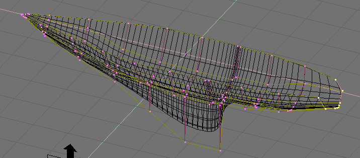 Give the curve the shape of the middle cross section of the ship, by adding vertices as needed with the Split button and, possibly, by setting the NURBS to 'Endpoint' both on 'U' and 'V' (Figure 34).