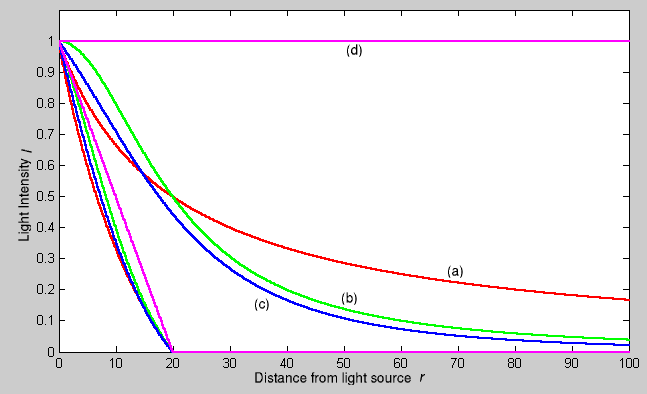 Figure 11. Light decays: a) Blender default linear; b) Blender default quadratic with Quad1=0, Quad2=1; c) Blender quadratic with Quad1=Quad2=0.5; d) Blender quadratic with Quad1=Quad2=0. Also shown in the graph the same curves, in the same colors, but with the Sphere button turned on.