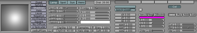 The lamp buttons can be divided into two categories: Those directly affecting light, which are clustered to the left, and those defining textures for the light, which are on the right and are very similar to those relative to materials. In the following subsections we will focus on the first category (Figure 2), leaving a brief discussion on texture to the Tweaking Light section.