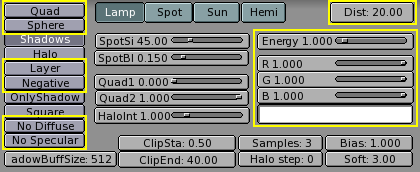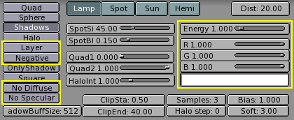 Besides the Negative and Layer buttons whose utilization is known, and the Quad and Sphere buttons, whose effect is the same as for the Lamp light, the other buttons (Figure 13) meanings are: