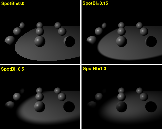SpotBl - the blending between the light cone and the surrounding unlit area. The lower the sharper the edge, the higher the softer. Please note that this applies only to the spot edges, not to the softness of the edges of the shadows cast by the spot, these latter are governed by another set of buttons described in the 'Shadows' subsection.