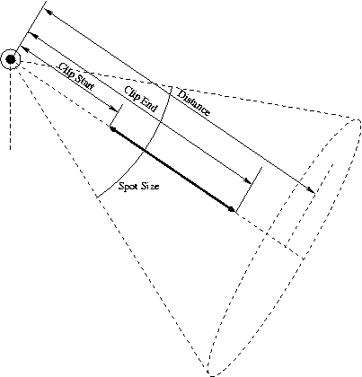 A Spot light is a cone shaped beam generated from the light source location, which is the tip of the cone, in a given direction. Figure 12 should clarify this.