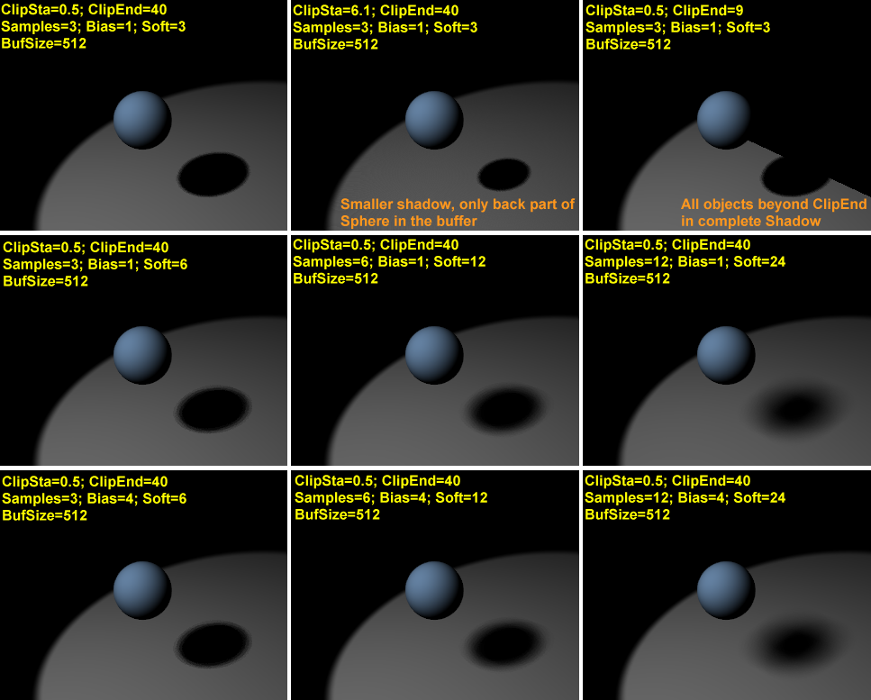 Samples - To obtain soft shadows the shadow buffer, once computed, is rendered via its own anti-aliasing algorithm which works by averaging the shadow value over a square of a side of a given number of pixels. Samples is the number of pixels. Its default is 3, that is a 3x3 square. Higher values give better anti-aliasing, and a slower computation time.
