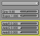 The World Buttons also contain the sliders to define the Ambient light. The effect of Ambient light is to provide a very simple alternative to Global Illumination, inasmuch as it lights up shadows.