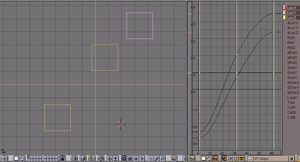 The easiest way to work with motion curves is to convert them to IPOKeys. We return to the situation in the previous example: we have specified two positions in an object IPO in frame 1 and frame 31 with "Insert Key". At the right of the screen, you can see an IPOWindow. We set the current frame to 21 (Figure 5).