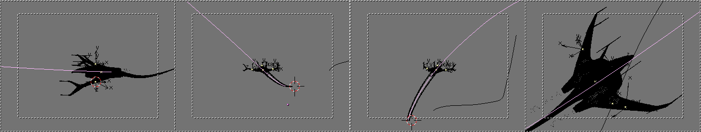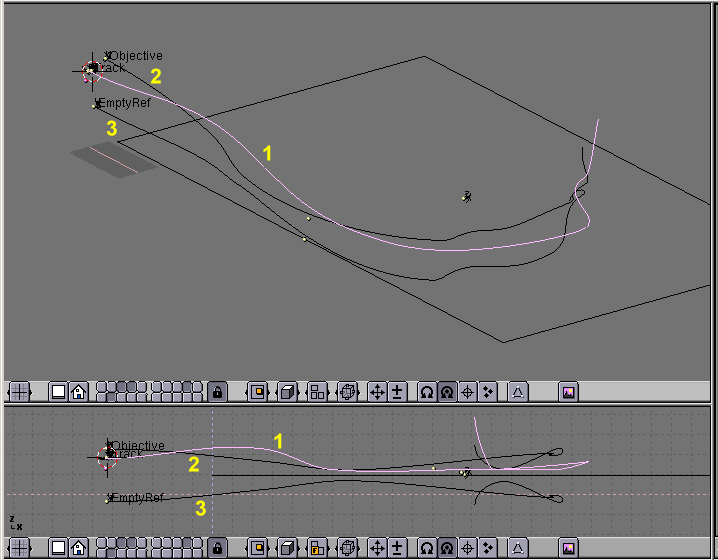 The fighter has an Empty named 'Track' Parented to it in a strategic position. A camera is then parented to another curve, Path 2, and follows it, tracking the 'Track' Empty. The Fighter has a constant time IPO, the camera has not. It goes faster, then slower, always tracking the Empty, and hence the fighter, so we will have very fluid movements of the camera from Fighter side, to Fighter front, other side, back, etc. (Figure 11)