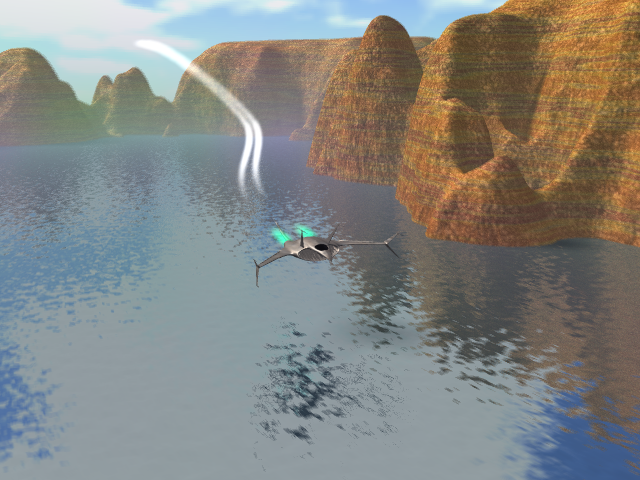 Figure 10 shows a complex application. We want to make a fighter dive into a canyon, fly next to the water and then rise again, all this by following it with our camera and, possibly, having reflection in the water!