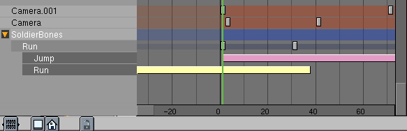 You can also use this window to perform action blending and other Non-Linear Animation tasks. You add and move action strips in a fashion similar to the sequence editor, and generate blending transitions for them.