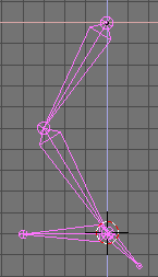 Well, that's it. Now test the armature. Grab "IK_foot" and move it up. Now grab "IK_toes" and move it down. The foot changes it's rotation, but it looks like the toes are disconnected from it. But if you animate carefully you'll always manage to keep the toes from going away from the foot. Now return the armature to it's initial pose. grab "IK_heel" and "LegHi" and move them up. Now the character is standing on his tiptoes. The foot may appear disconnected from the toes again, but you can fix the pose by selecting "IK_heel" only and moving it a bit forward or backwards. This setup may not be the most easy one for animation, but gives you more possibilities that the previous setups. Usually when you don't need to make your character stand on tiptoe, you've better stick to some of the easier setups. You'll never make a perfect setup. You can just improve, but there will always be shortcomings. Feel free to experiment and if you invent something better, don't hesitate to drop an e-mail to: lpk3d@yahoo.com.